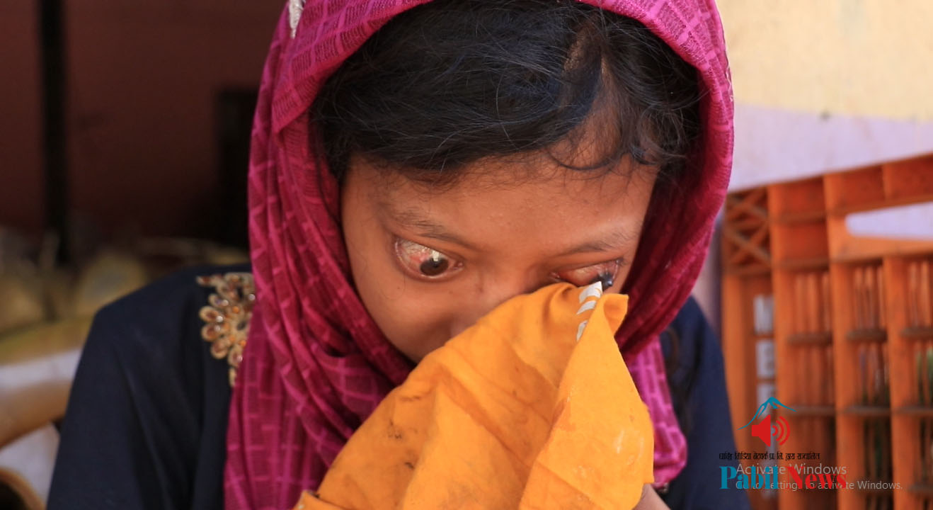 धादिङको वेनिघाट रोराङ–२, आपटारकी शान्तिको दुबै आँखाका गेडी बाहिर निस्किएका छन् । देब्रे आँखाको नानीमा मासु पलाएको छ । एकनासले आँसु बगिरहन्छ । रुमालले आँसु पुछेर पत्तै लाग्दैन । मानिसहरु उनको आँखा हेर्न समेत डराउँछन् । डरलाग्दो आँखा बोकेर उनले धेरै ठाउँ चाहरिसकिन् । ‘टाउको पनि घनले हानेजस्तै बल्किन्छ, ब्रुसेट खाएर सुत्छु भन्दा पनि निदाउन मिल्दैन’ उनको पीडा परैबाट देखिन्छ ।