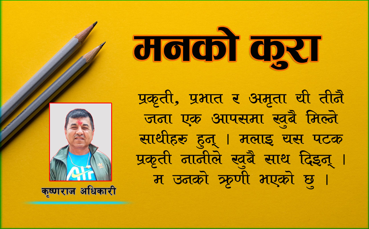 प्रकृतीको कुरा गर्दा मलाइ केही भनु जस्तो लाग्यो । पेशाले चिकित्सक हाम्री प्रकृती म उनलाई छोरी भनेर सम्बोधन गर्न रुचाउंछु किन भने उनी मेरी छोरीकी मिल्ने साथी या रुम पाटनर । धेरै पटक मेरो घरमा आइ पारीवारीक वातावरण सिर्जना गरेकी छिन् । प्रकृती, प्रभात र अमृता यी तीनैजना एक आपसमा खुबै मिल्ने साथीहरु हुन् । यी तीन मध्ये प्रभात सरल स्वभावका दुःख आपतमा सहयोग गर्न पर्छ भन्ने भावनाका युवा जोश र जांगरले भरीका । अमृता पढाइमा अब्बल एक पटक पढे देखेको कुरा सधैं स्मरण भै रहने अद्भुत दैवीशक्ती । व्यवहारीकतामा भने अलि नखारिएको । प्रकृती चै बिजुली चम्के जस्तै जता पनि चम्कन सक्ने । देश काल परीस्थितिलाई राम्रैसंग बुझेकी । टाक्कटुक्क कुरा मिलाइ हाल्ने नाता सम्बन्ध जोडेर आफ्नो बनाउन भ्याइहाल्ने ।