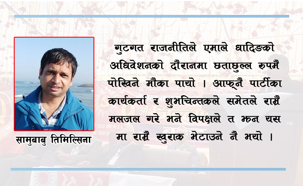 यतिबेला नेकपा एमाले धादिङको नवौं जिल्ला अधिवेशन चर्चाले फेरी स्थान पाएको छ । माघ १९ गते उद्घाटन भएको एमाले धादिङको नवौं जिल्ला अधिवेशन माघ २० गते विहान बन्द सत्र शुरु हुने क्रममै रोकिन पुग्यो । यस विचमा सामाजिक सञ्जालमा धेरै टिका टिप्पणी, आरोप प्रत्यारोप मात्र नभएर एक अर्को पक्षका विचमा गाली गलौजको अवस्थासम्म पुग्यो । यसमा धेरै एमालेकै जिल्ला तहका नेताहरु सक्रिय भएर लागे । भित्री रुपमा रहेको गुटगत राजनीतिले यस अधिवेशनको दौरानमा छताछुल्ल रुपमै पोखिने मौका पायो । विवाद चर्कदै गएपछि आफ्नै पार्टीका कार्यकर्ता र शुभचिन्तकले समेतले राम्रै मलजल गरे भने विपक्षले त झन यसमा राम्रै खुराक भेटाउने नै भयो । जे हुनु नपर्ने थियो आखिर त्यही भयो एमाले धादिङको नवौं जिल्ला अविधेशनका क्रममा ।