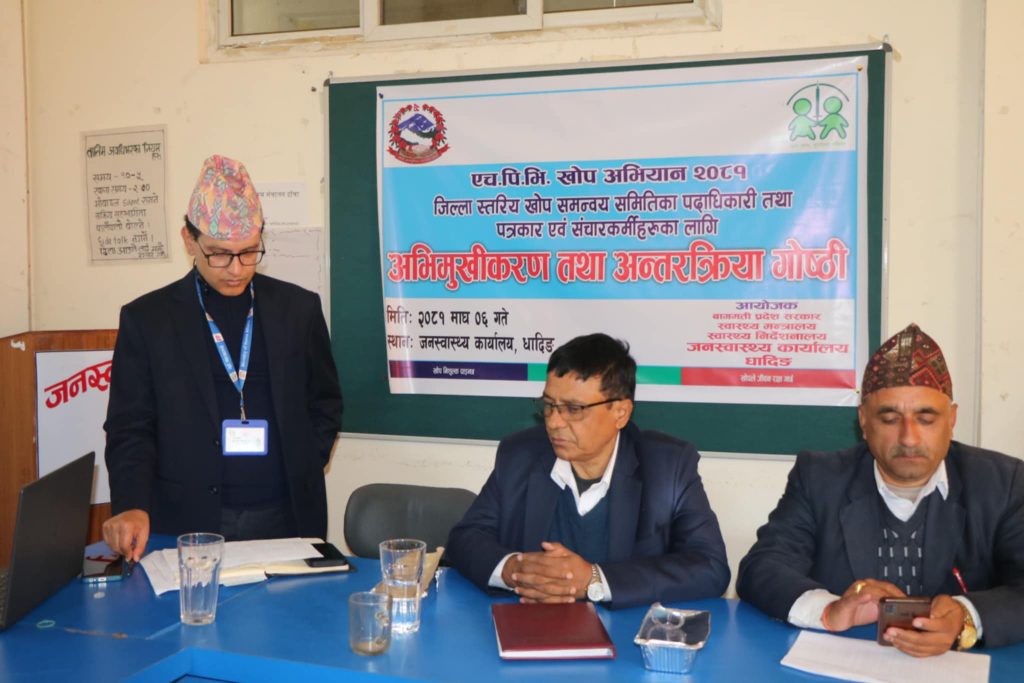 धादिङ-धादिङको १३ वटै स्थानिय तहमा माघ २२ गतेदेखि धादिङमा पाठेघर क्यान्सरविरुद्ध एचपिभि खोप लगाइने भएको छ । पाठेघरको मुखको क्यान्सरबाट सुरक्षित राख्ने उद्देश्यले १० देखि १४ वर्षका किशोरीहरुलाई माघ २२ गतेदेखि खोप लगाउन लागिएको हो ।