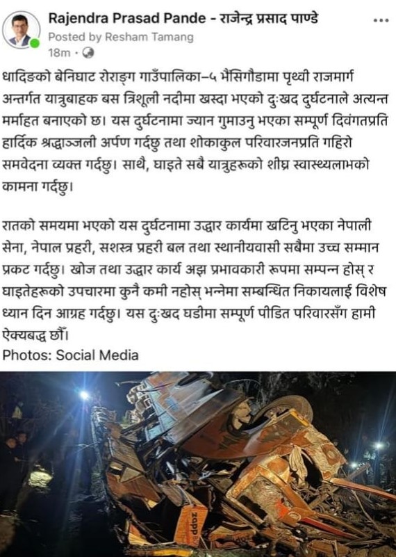 पृथ्वी राजमार्ग अन्तर्गत बेनिघाट रोराङ्ग–५ भैंसिगौडास्थित रोराङमा बस दुर्घटना हुँदा १९ जनाको ज्यान गएको घटना प्रति नेपाली कम्युनिस्ट पार्टीका नेता तथा धादिङ क्षेत्र नम्बर–१ का उम्मेदवार राजेन्द्र प्रसाद पाण्डेले दु:ख ब्यक्त्त गरेका छन ।
