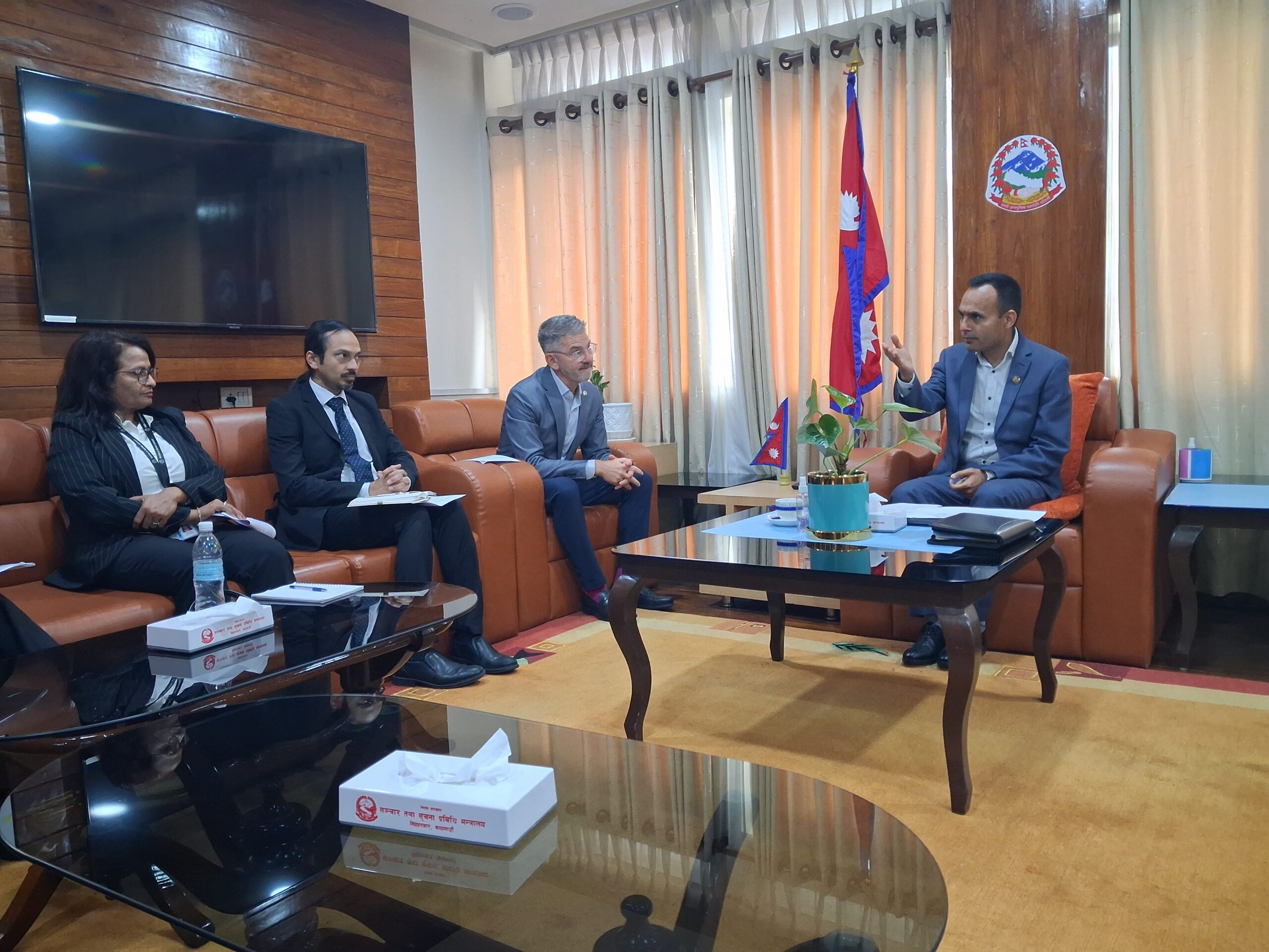 काठमाडौँ : सञ्चार तथा सूचना प्रविधिमन्त्री डा. विक्रम तिमिल्सिनासँग नेपालका लागि विश्व बैंकका देशीय निर्देशक डेभिड सिस्लेन नेतृत्वको प्रतिनिधिमण्डलले उहाँको कार्यकक्षमा शिष्टाचार भेट गरेको छ ।