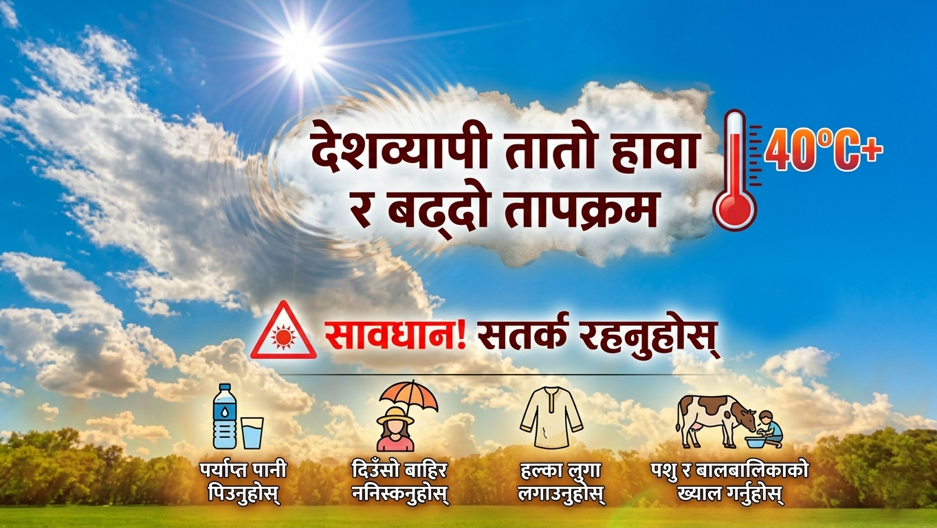 त्यस्तै लुम्बिनी र सुदूरपश्चिम प्रदेशका तराई क्षेत्रमा तातो हावाको लहरको पनि सम्भावना देखिएकोले महाशाखाले पछिल्लो सूचनामा अध्यावधिक रहन तथा आवश्यक सतर्कता अपनाउनुहुन अनुरोध गरेको छ ।